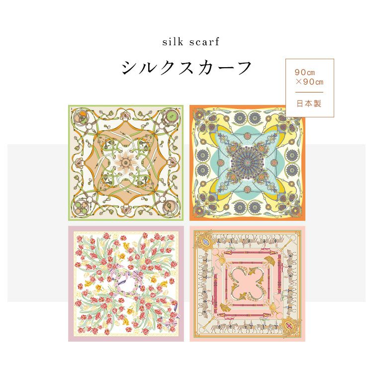 世界トップクラスの技術で紡ぐスカーフブランド キヌフローレス。正方形スカーフはベルトやバッグチャームとして巻くのも可愛い。お母さん 彼女 妻(奥さん)へのお祝いのプレゼントや記念日 誕生日ギフトに フローラル スカーフ シルク100% ツイル 横浜スカーフ 日本製 90×90 正方形 大判 花柄
