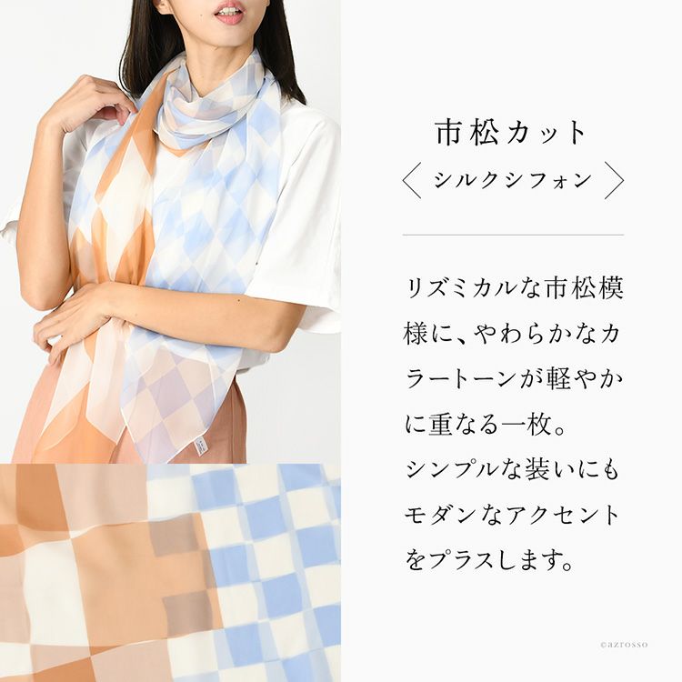 日本製・シルク100%スカーフ。横浜スカーフブランドKINU flawless(キヌ フローレス)の幾何学模様柄シルクスカーフ「市松カット」。女性への誕生日ギフトにもおすすめの大判ストール風スカーフ 市松カット シルク シフォン ストール 幾何学模様柄 シルク100% 95cm×170cm 長方形 日本製 横浜スカーフ 【通常ネコポス配送】