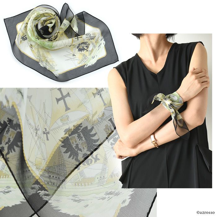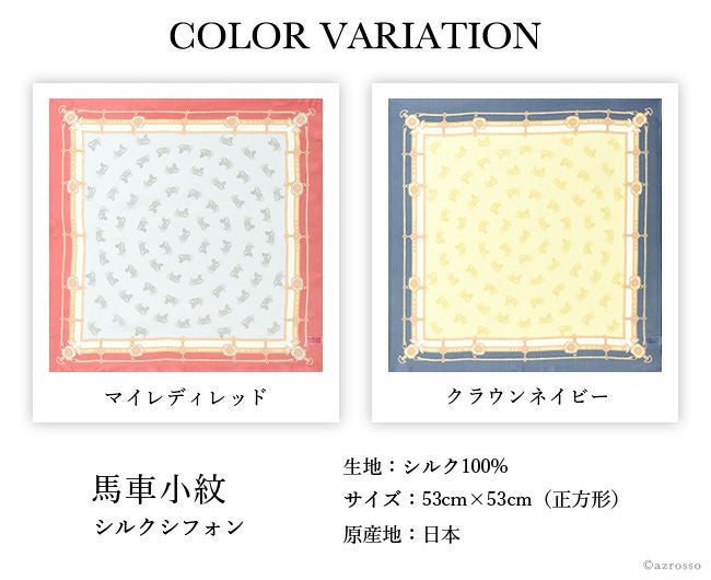 エレガントなデザインで人気の横浜スカーフブランド キヌフローレス(KINU flawless)のシルク 100% ミニスカーフ 馬車小紋のデザインのシルクシフォンの春夏プチスカーフをコーディネートのアクセントに/ シルク スカーフ 日本製 馬車小紋 横浜スカーフ シフォン 53×53 正方形 ミニ