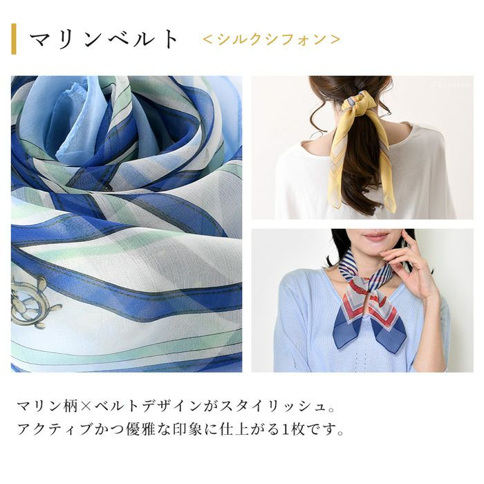 55×55|キヌフローレス(KINU flawless) のストライプが爽やかなシルクスカーフ。母の日、敬老の日、女性への誕生日プレゼントにも マリンベルト 横浜スカーフ シルクシフォンミニ マリン柄 日本製 シルクスカーフ プチ ミニサイズ スカーフ 正方形 シルク100% 53×53cm