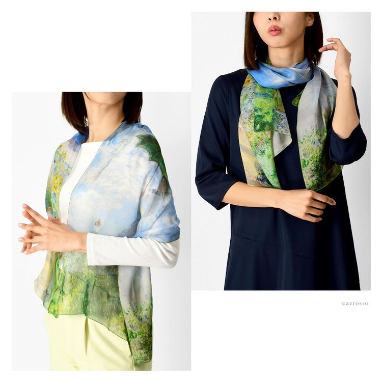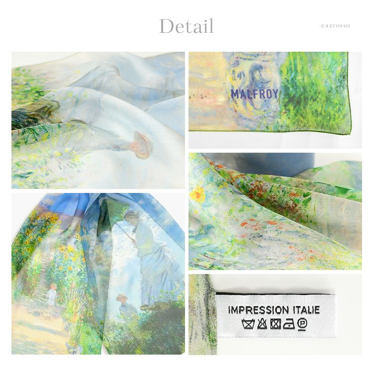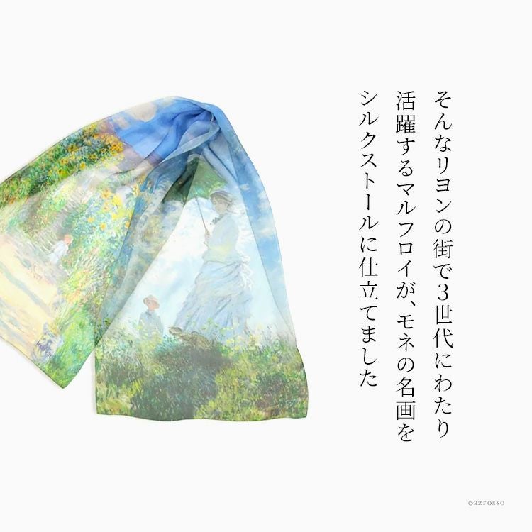 モネの名画「散歩、日傘をさす女」「ヴェトゥイユのモネの庭」を身に纏う。フランスブランドMALFROY(マルフロイ)のアートなシルクスカーフ。上質なシルク100%で誕生日や母の日ギフトに最適です。 絵画 スカーフ シルク100% シフォン ストール 薄手 長方形 43cm×140cm 大判 名画 モネ 日傘をさす女 ヴェトゥイユのモネの庭 フランス製 ブランド