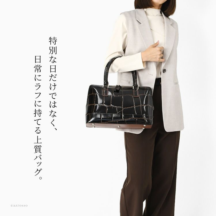 日本製 クロコ型押し ボストンバッグ レディース 軽量 おしゃれ A4 本革 トートバッグ ハンドバッグ 自立 底鋲 通勤 フォーマル