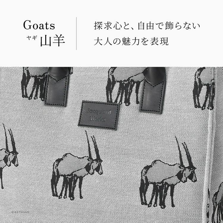 ▼特徴:日本製 ポリエステル 日常撥水 持ち手 レザー ビジネス トートバッグ 軽量 丈夫 A4収納 小さめ バッグ スクエア ペットボトル入る ジャガード織り ジャカード織り 高級 手提げバッグ ジャカードワークス ブックトート ブラック ゴート 山羊 ヤギ やぎ 柄 アートバッグ 黒 グレー ブラウン カーキ