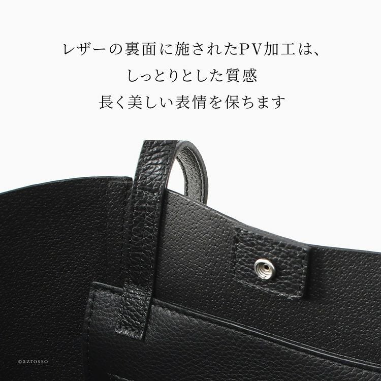 レザーの裏面に施されたPV加工が、革の裏からの毛羽立ちを抑え、長く美しい表情を保ちます。しっとりとした質感で肌あたりが良く、荷物の出し入れも快適です。