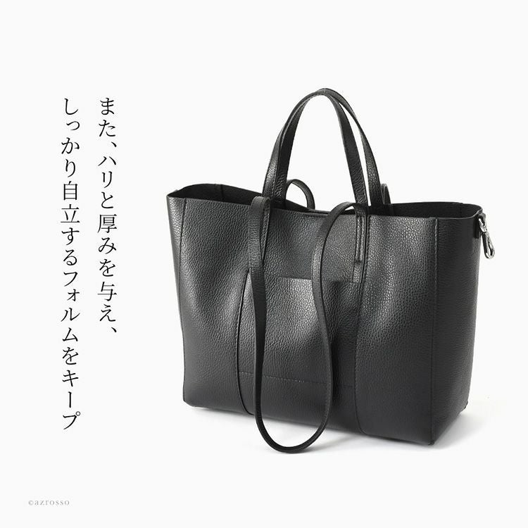 しっとりとした質感は、荷物の出し入れのたびに心地よく手になじみます。また、革にハリと厚みを与え、しっかり自立するフォルムをキープ。商談の場でも、スマートな佇まいを崩しません。