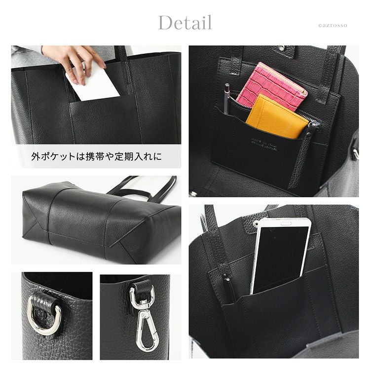 持ち手も丈夫なつくりです。持ち手は、長さ違い(長短)の2種。ハンド持ちでかっちりと、肩掛けのショルダーバッグとしてもご活用いただけ、シーンやコーディネートに合わせて自在に使い分けられます。細見ながらもレザーが重ねてあり、厚みを持たせることで丈夫さ(耐久性)を確保。たくさんの荷物を入れて重くなっても、手に食い込みにくく、持ち運びやすい設計となっています。