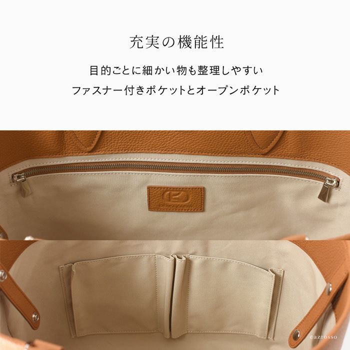 ファスナー付きで安心な、イタリア製本革トートバッグ。A4対応の大容量で通勤やビジネスにも活躍します。仕切りやポケットの多いバッグインバッグ付きで整理しやすい、イタリアブランドのファスナートートバッグ イタリア製 トートバッグ レディース 本革 ファスナー 付き 大容量 レザー A4 通勤 肩掛け 大きめ 仕切り ビジネストートバッグ