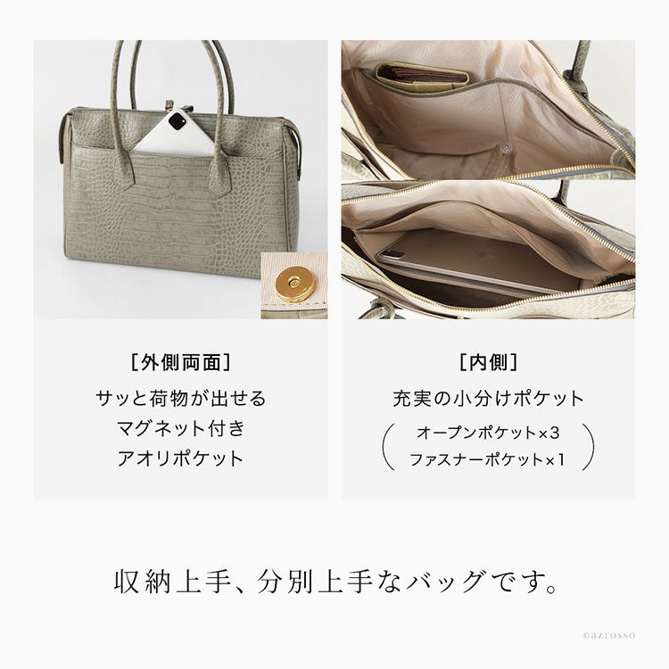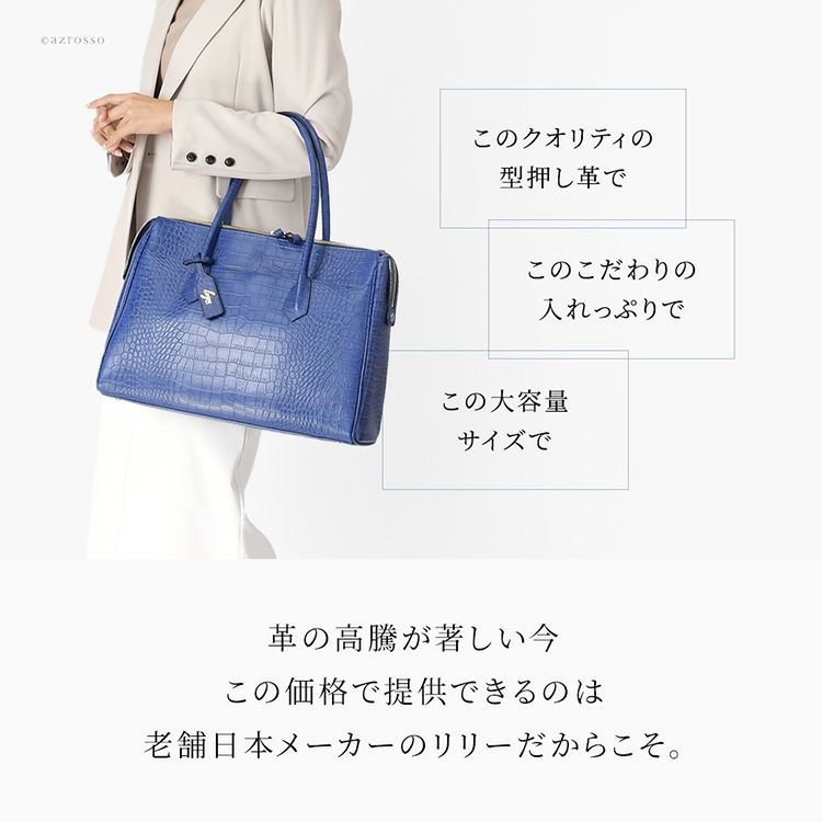 働く女性の要望に応えるクロコ型押しレザートートバッグ。美しい発色の本革に高級感漂うクロコエンボスが施された人気シリーズ。B4対応で使いやすい、通勤 お仕事 出張 外回り 営業におすすめの日本製ビジネスバッグ クロコ型押し トートバッグ 本革 ビジネスバッグ B4 A4対応 日本製 底鋲付き 自立 肩掛け可能 大容量