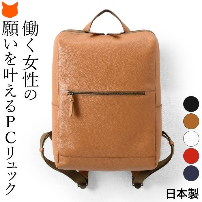 華美すぎず、地味過ぎず、本革の良さを生かしたミニマルなデザインのPCリュックは、通勤コーデも女性的かつスタイリッシュにまとめてくれます。角は少し丸みを帯びた形に縫製、横から見るとマチはしっかりあるのに、上部にかけて少し幅を狭くしているので、大容量サイズでも野暮ったさがなくスッキリと背中にフィット。また、荷物が重くなった時、肩への負担を軽減するクッション入りのショルダーストラップは、肩こりの多い女性を労わるこだわり。