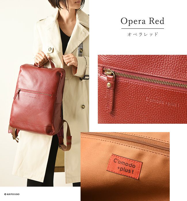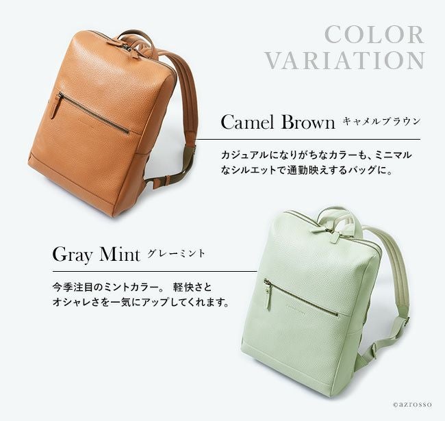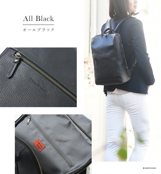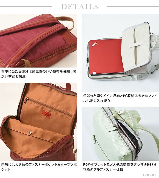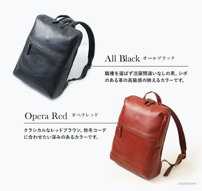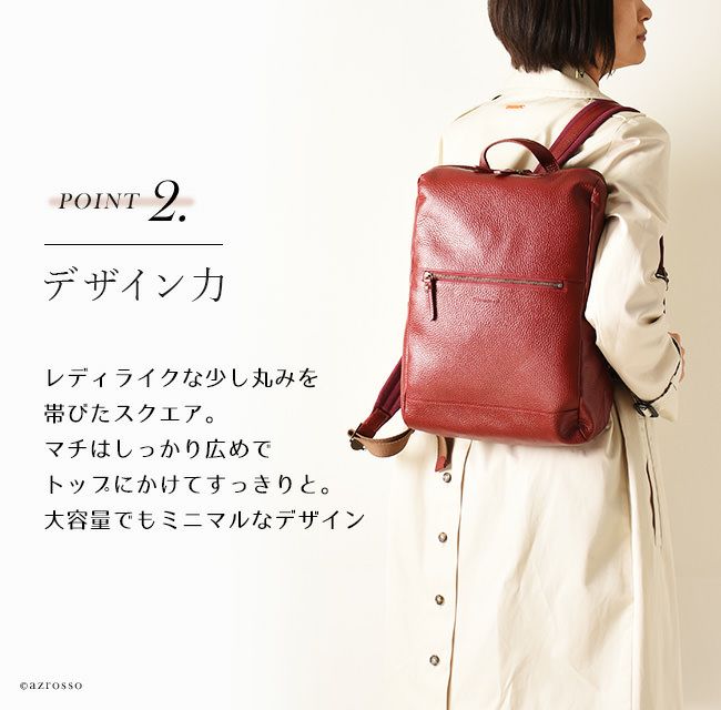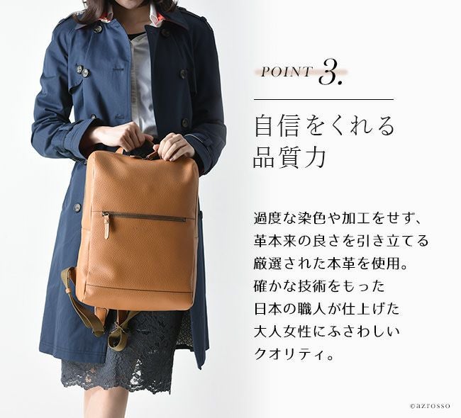 ビジネスシーンはもちろん、雑誌や書類もスッキリ収まるレザーリュックサックは、通学や旅行、マザーバッグとしてもおすすめです。