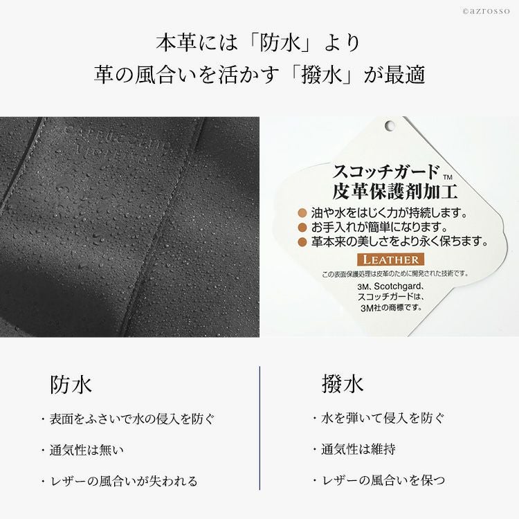 ・革の質感に違いを感じる場合がございますが、本革の性質由来のもので、撥水効果に変わりはありません。 |