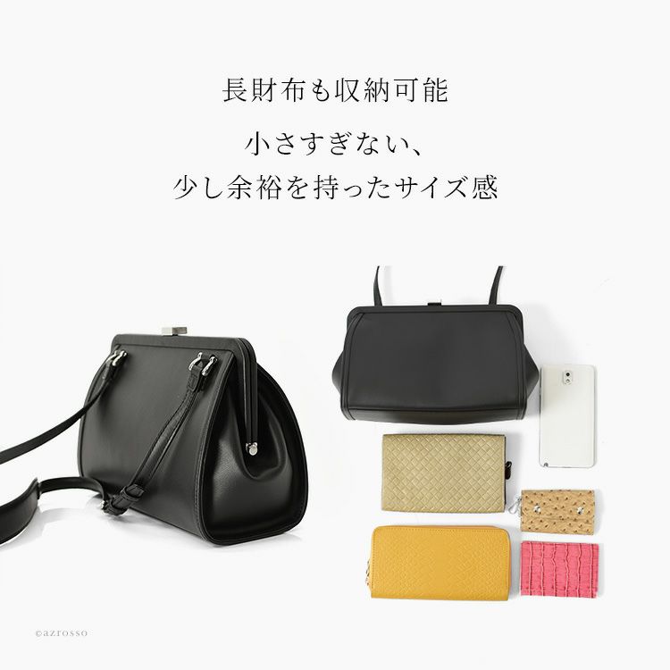 陶器のような美しいスムースレザーを使用した日本製Atelier NuuのショルダーバッグL。片手でカパッと開けられるシックなデザインのがま口ショルダーは、フォーマルにも大人カジュアルにもお楽しみ頂けます がま口 ショルダーバッグ 斜めがけ 軽い おしゃれ きれいめ かっこいい ミニバッグ レザー 本革 黒 グレー 日本製 ブランド アトリエヌウ clay L レディース