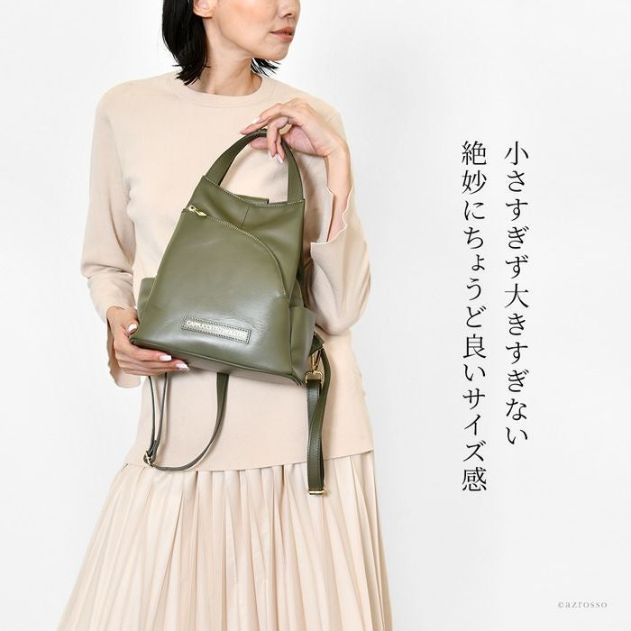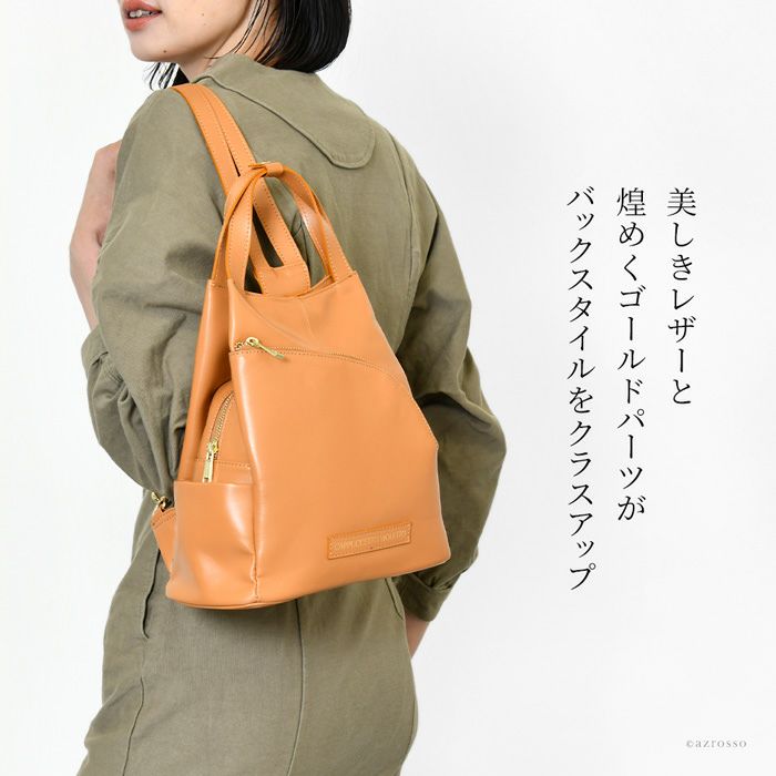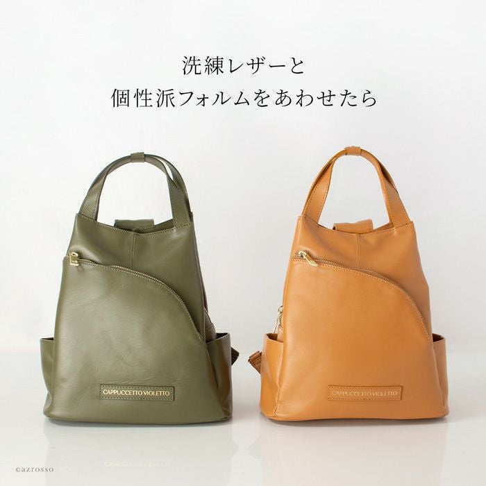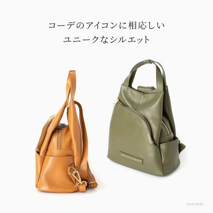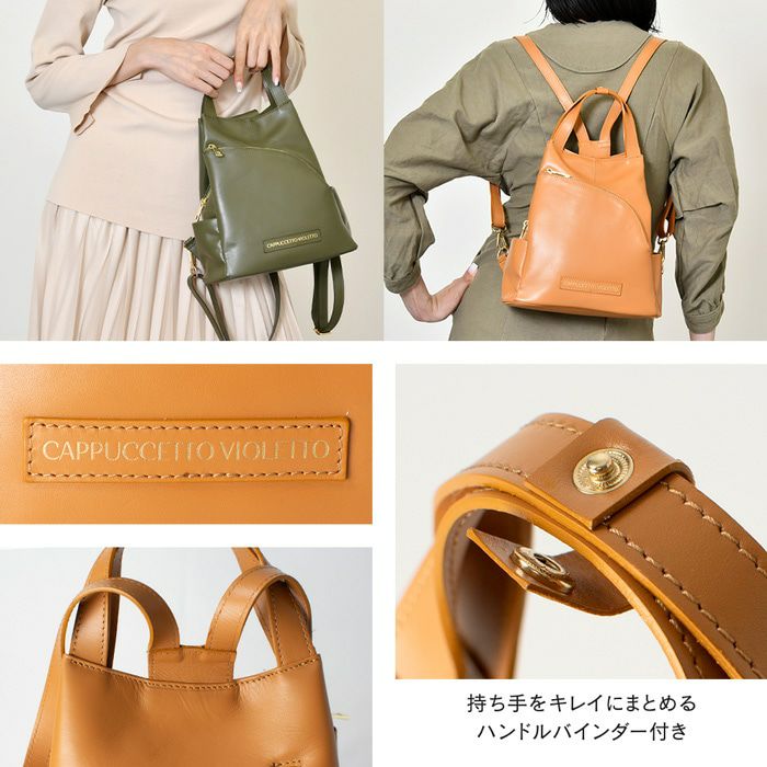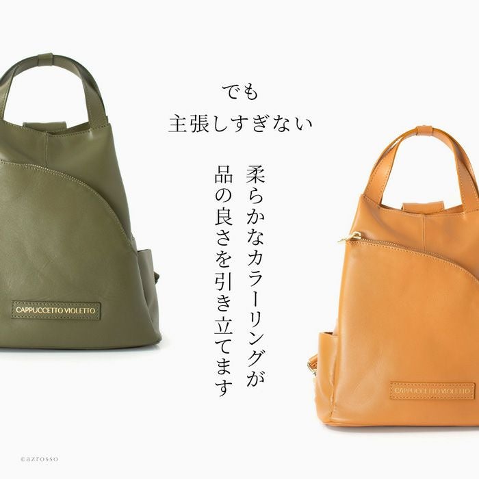 リュック自体がカジュアルな印象になりがちですが、ハンドバッグのように洗練されていて、