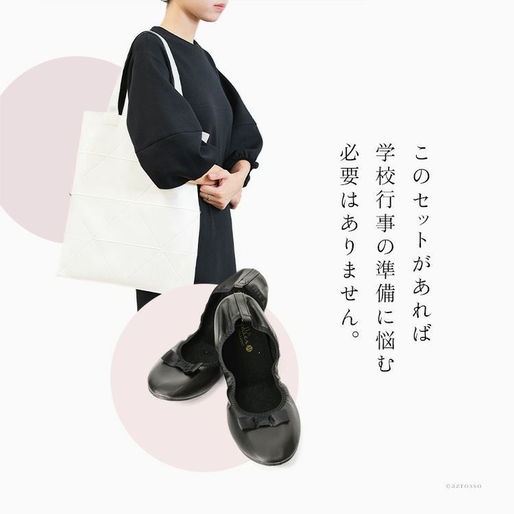 授業参観や面談など様々な学校行事に対応する、折りたたみバッグと携帯スリッパのセット。カバンはトートバッグ・ハンドバッグとして使える2種のハンドル付き。単品購入より断然お得なセットアイテム 学校行事に使えるセット 折りたたみトートバッグ 携帯スリッパ リボン付き 軽量 A4 持ち運び レディース