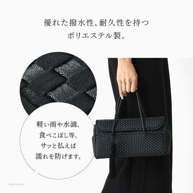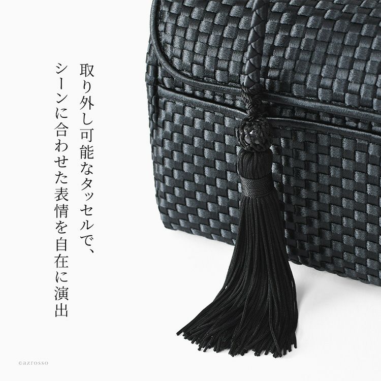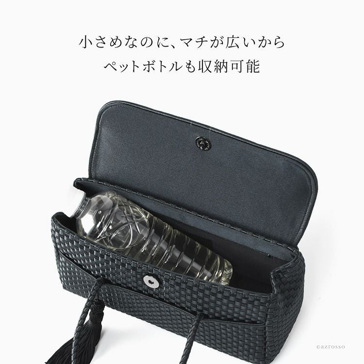 日本の老舗Takaya(高屋)ブランド アルカンの上品なサテン生地のフォーマルバッグ。小さめなのにマチ広でペットボトルも収納可能。入学式や卒業式、お受験、結婚式など冠婚葬祭から普段使いまで使える万能なバッグ。 フォーマル ミニバッグ 慶弔両用 黒 普段使い 小さめ 自立する タッセル付き 撥水 冠婚葬祭 セレモニー ブラックフォーマル 日本製 高屋 アルカン