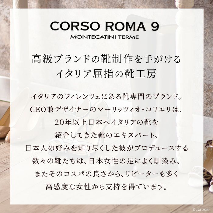 Maurizio Corriei(マウリッツィオ・コリエリ)は、約30年靴の業界に従事してきたシューズのエキスパート。イタリアの有名メーカーブランドシューズのサプライヤーとして20年にわたり日本にイタリアの靴を紹介してきました。その長年の経験を生かし、2005年に独自ブランドCORSO ROMA 9(コルソローマノーヴェ)を設立。長い間、日本の女性達に靴を紹介してきた実績は、日本人の好みを熟知していることから人気を博しました。シンフーライフは、先駆けてECサイトでコルソローマ9を紹介しました。その後またたく間に人気となり現在、日本の有名デパートやセレクトショップはもちろん、「BAILA」「CLASSY」「GINGER」「VERY」など数多くのファッション雑誌で取り上げられています。コルソローマのパンプスやブーツ、あらゆる靴のデザインはすべてMaurizioが手掛けています。日本人のニーズに合わせたデザインをコンセプトに製作しているので、本国イタリアよりも日本での人気が高いブランドです。