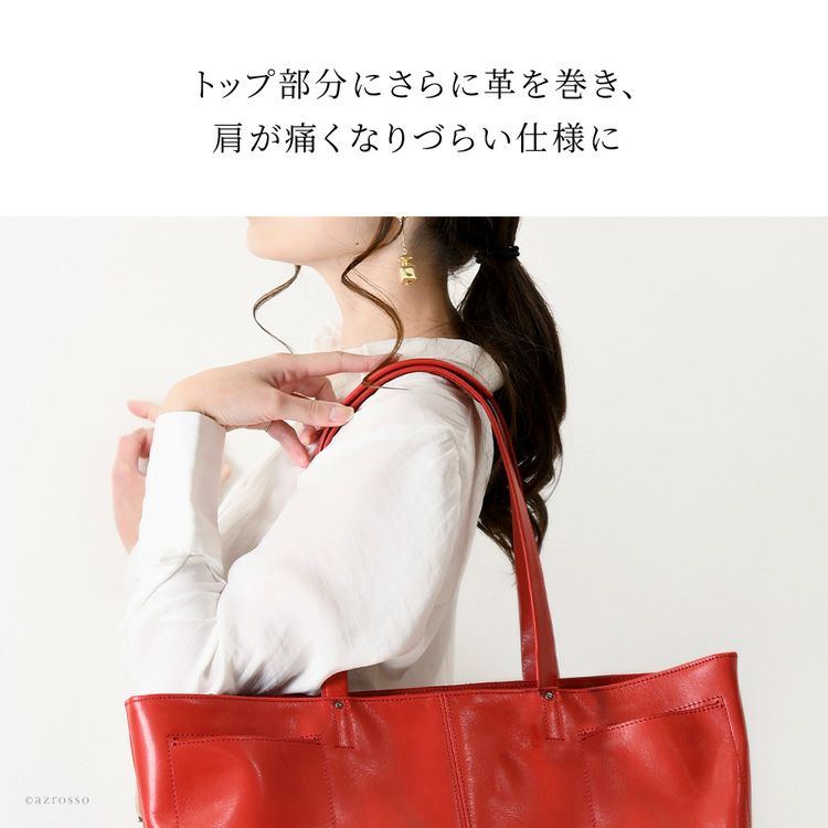 キャリアを重ねる女性にふさわしい、きれいな形のレザートートバッグ。A4やA4以上のファイルや雑誌、資料も入ります。タフに使いたいビジネスバッグだからこそ丈夫さにも気を配りたい。傷のつきにくいレザー、撥水加工の施されたレザーは、忙しいアクティブに働く大人の女性をしっかりサポートしてくれます。