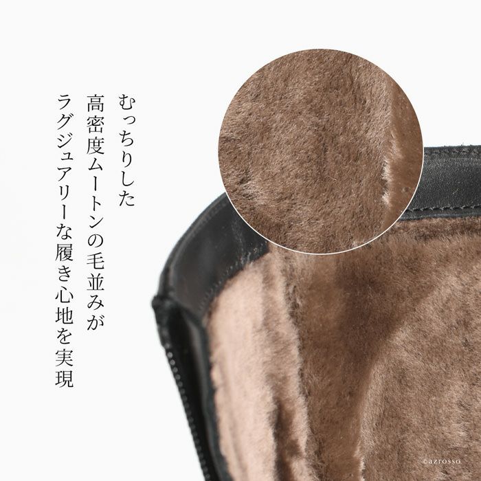外見からはなかにムートンが敷き詰められているとはわからないデザイン。なのに、脚を通したときに触れるむっちりと密度の高いムートンの毛並みはストレスの多い冬の朝の癒しとなるはず。