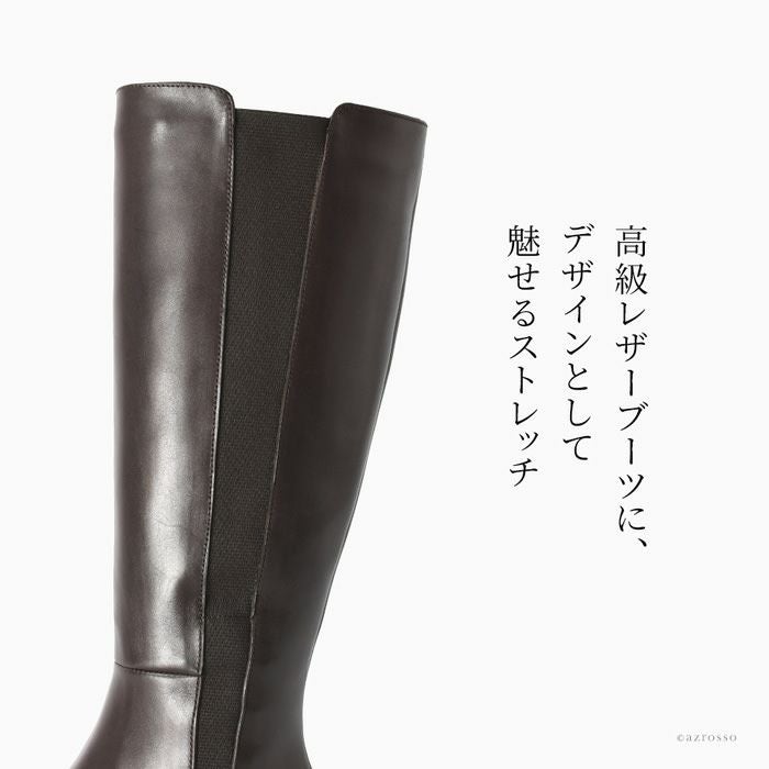 カルピエッレは、ストレッチゴムそのものをデザインととらえ、サイドに鋭い縦のラインとして思いっきりのストレッチ。ただし、レザーと同系色でまとめているため、悪目立ちはせず、すっきりとしたロングブーツに仕上げました。