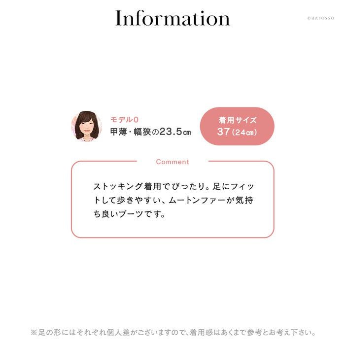 コメント:ストッキング着用でぴったり。足にフィットして歩きやすい、ムートンファーが気持ち良いブーツです。