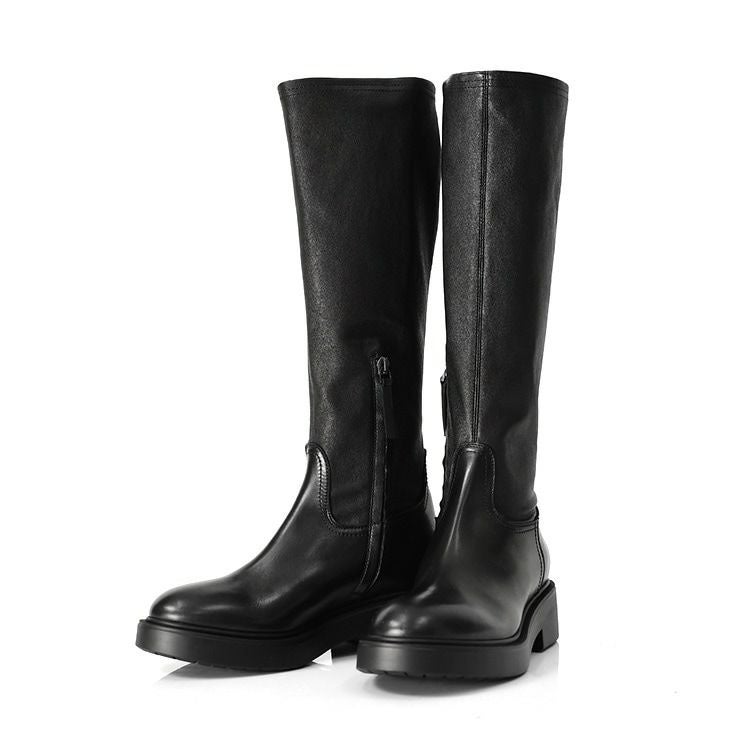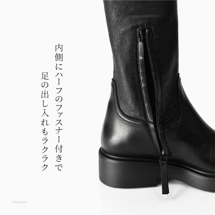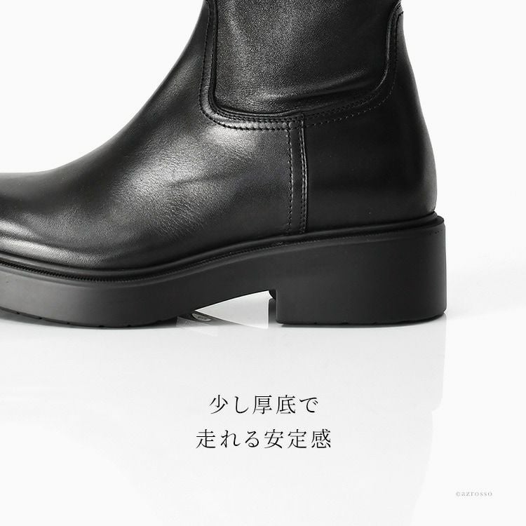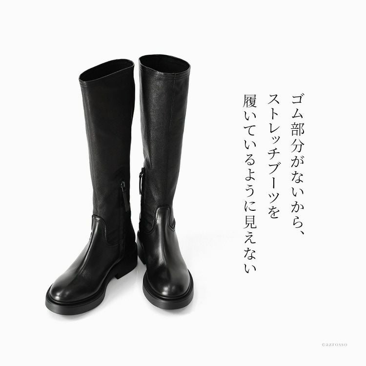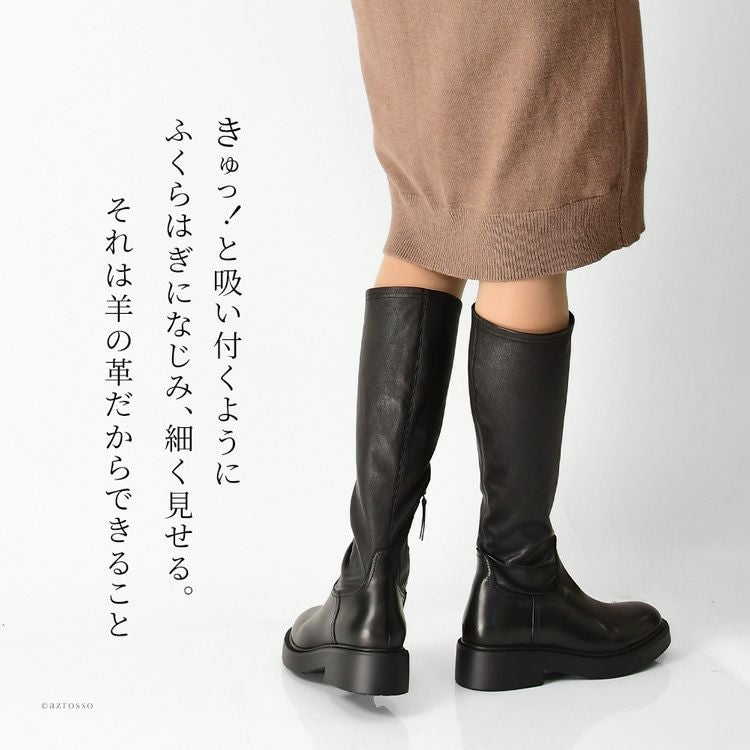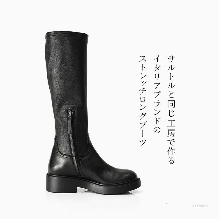 イタリア製 ストレッチ ロングブーツ 本革 厚底 サイドファスナー ラウンドトゥ ふくらはぎ太め ブラック イタリアブランド レディース