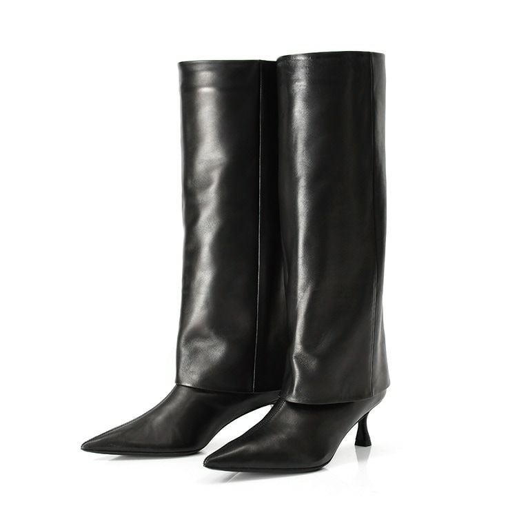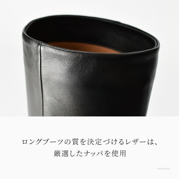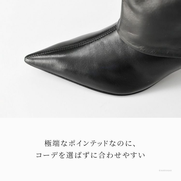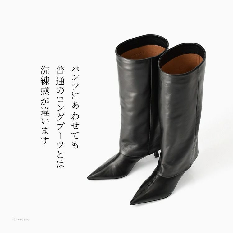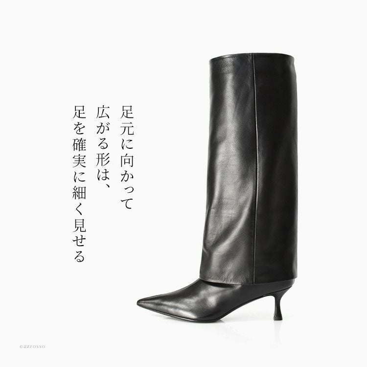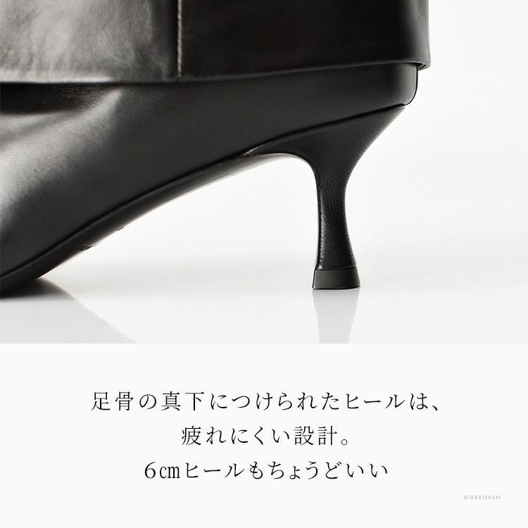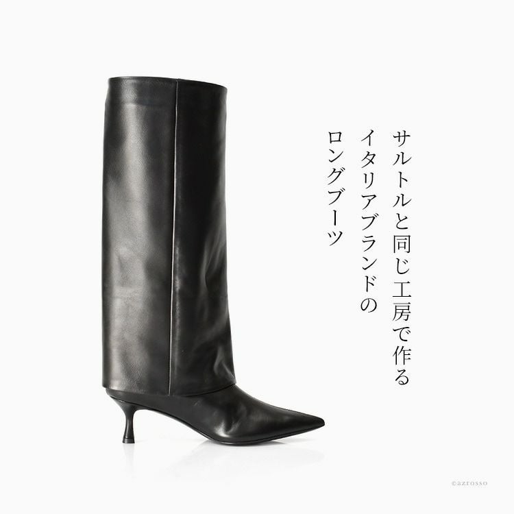 イタリア製 ブーツカット ロングブーツ 本革 6cmミドルヒール ポインテッドトゥ ふくらはぎ太め ブラック イタリアブランド レディース