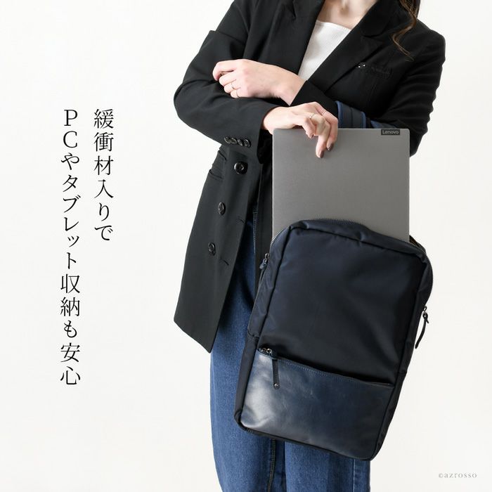 より軽量なビジネスリュックを求める女性に嬉しいナイロン×本革仕様。ナイロンをメインに作ったリュックは、防弾チョッキにも使われるタフネスな素材でつくっています。シンプル&スタイリッシュなデザインで、働く女性がとてもカッコ良く背負えるシルエット。緩衝材入でPCやタブレット収納も出来ます。