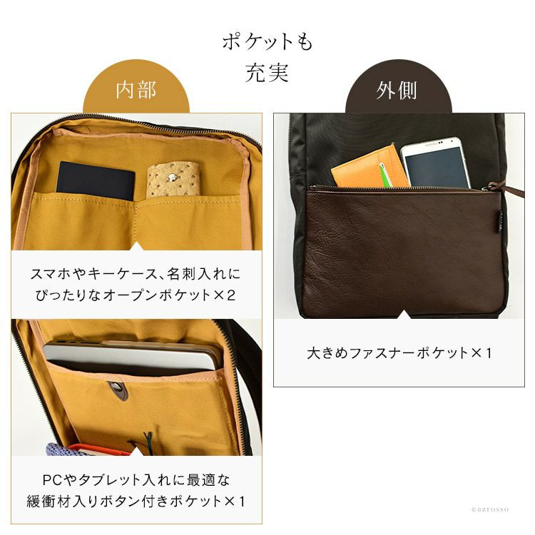 質・デザイン・作り。すべてを大人のビジネスウーマン向けに特化して作られた、お仕事用のビジネスリュック。スーツにかっこよく馴染む1本を、日本のデザイナーが一生懸命考え、国内で仕上げた逸品。ポケットが細かく分かれているので、荷物の整理整頓もしやすく、リュック本体を開けた時に、荷物が非常に見やすくなっています。