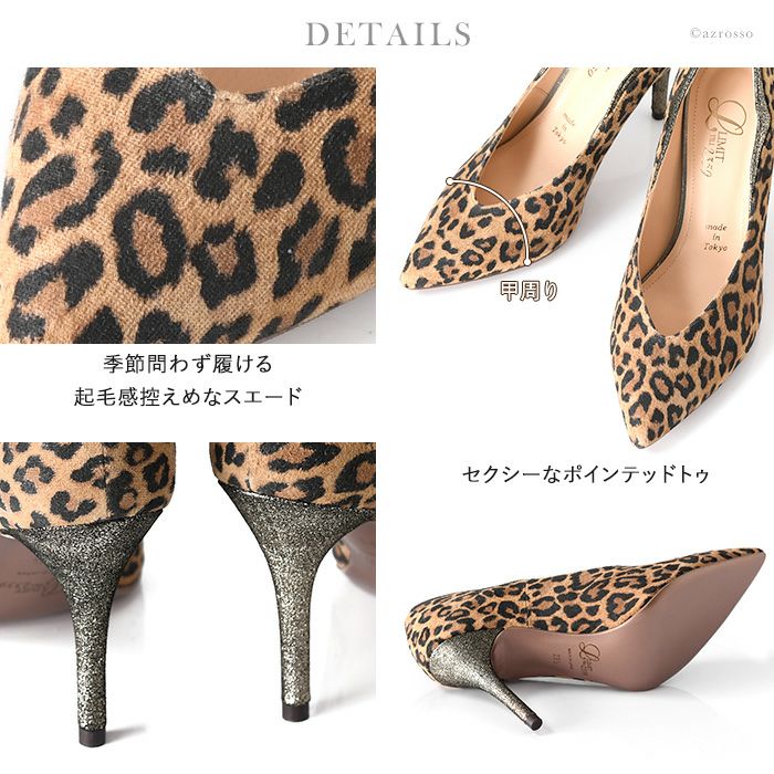 後ろ姿まで美しく魅せる。煌めくグリッターヒールがエレガントなレオパードパンプス。深めのVカットがトレンド感を演出しつつ、足をしっかりホールド。パーティーシーンにぴったりのレディースパンプス 21.5cm-25cm|ヒール9cm レオパード パンプス スエード レザー グリッター ヒール Vカット リミットティル2359