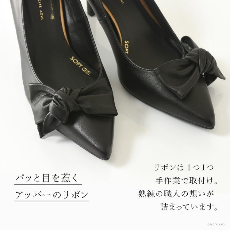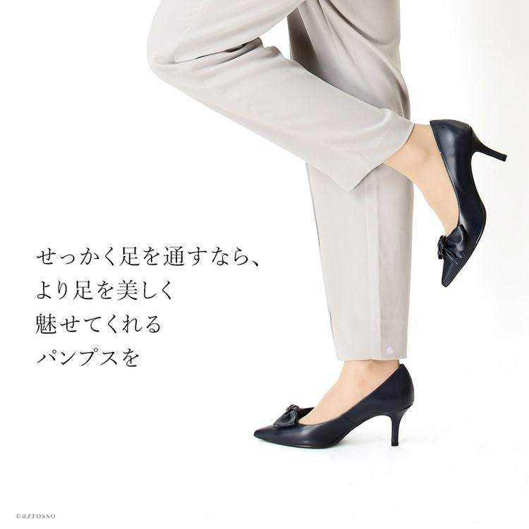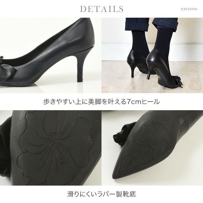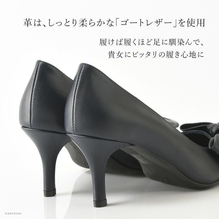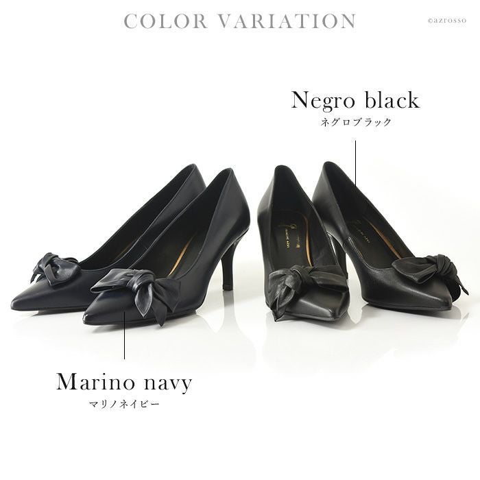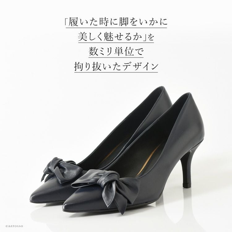 22cm-25.5cm|ビッグリボン パンプス ヒール7cm レザー ポインテッドトゥ 本革 黒 ブラック ネイビー 紺