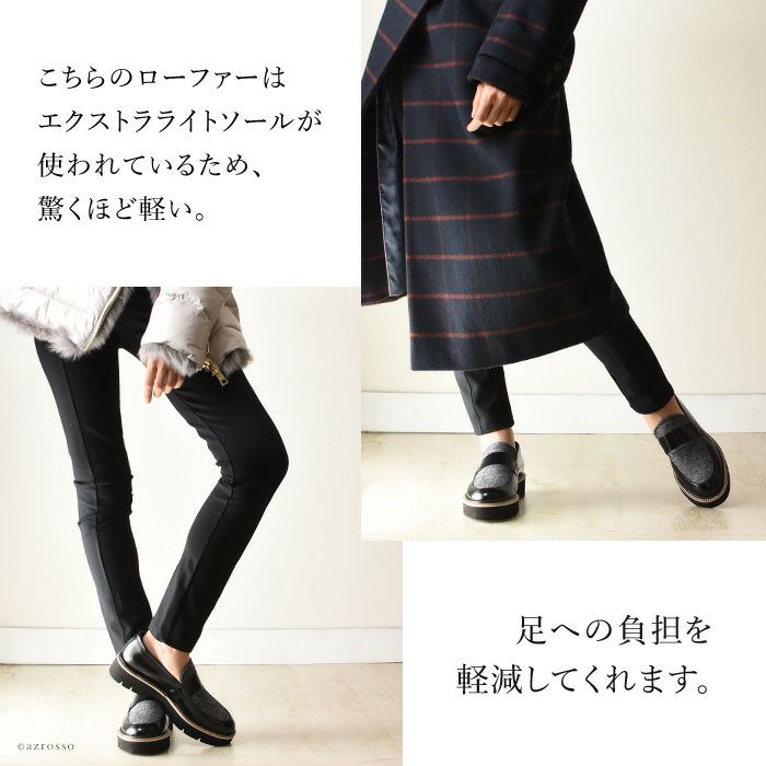 足への負担を軽減プリーツスカートなどのフェミニンなアイテムと合わせれば抜け感をプラス、もちろんパンツスタイルのハンサムコーデもお任せです。お洒落さと履き心地を両立させたローファーです。