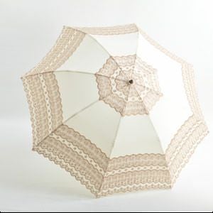 地中海の青い海と、白い街並みに溶け込むような、エキゾチックな日傘。どこかノスタルジックな雰囲気の布製の美しいレース造りの日傘。