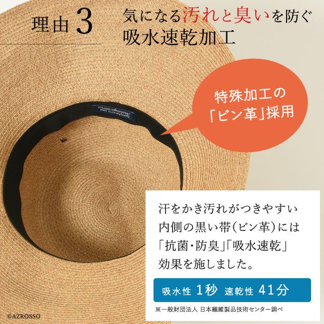 【理由3】汗をかいて汚れやすい、おでこや頭が直接が当たる部分の黒い帯(びん革)には、抗菌防臭加工と吸水足乾の特殊加工を搭載しました。汗をすぐに吸い取り、しかも早く乾きます。汚れや臭いを防いでくれるので夏の暑い日も安心です。
