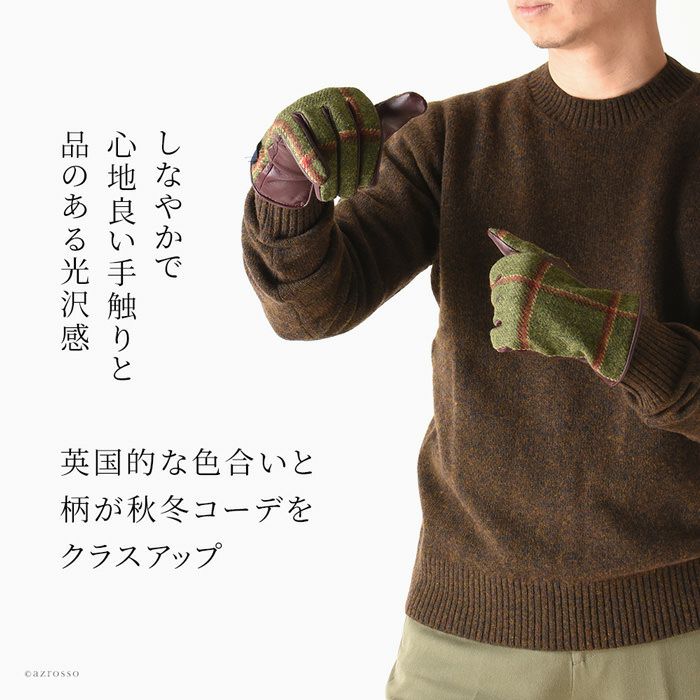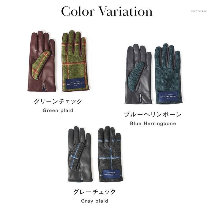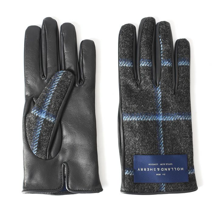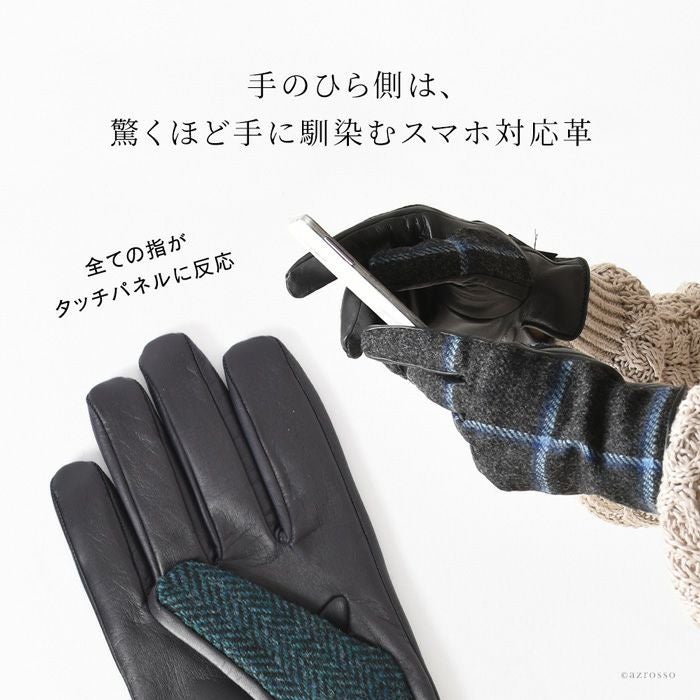 ▼特徴:ウール|Holland & Sherry|ホーランド&シェリー|スマホ対応|タッチパネル対応|レザー切替グローブ|暖かい|防寒|5本指|革手袋|チェック柄|格子柄|ヘリンボーン柄|異素材ミックス