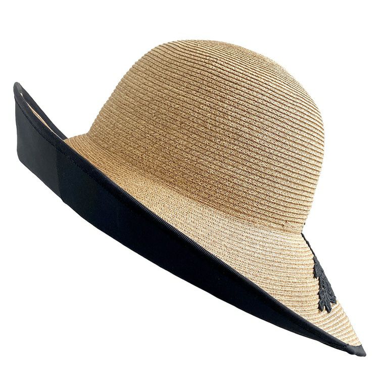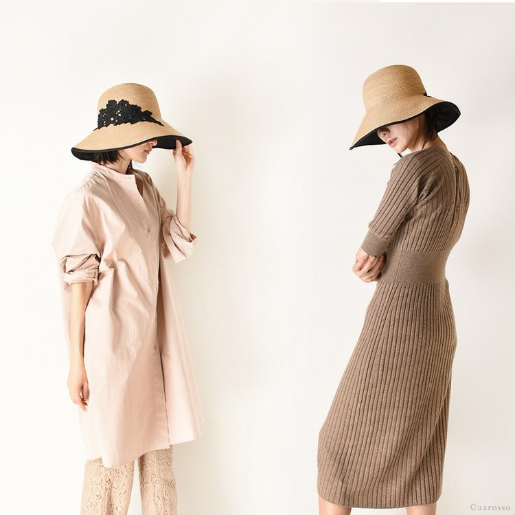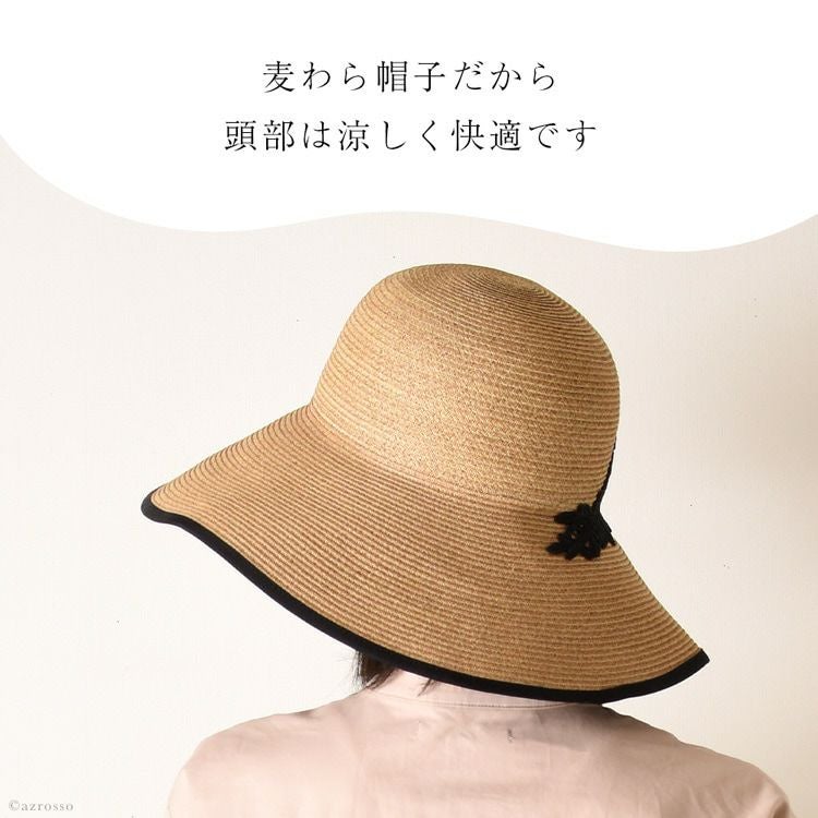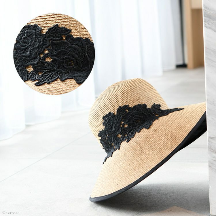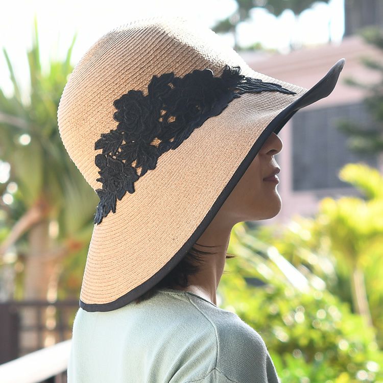 ブリム12cm つば広 キャペリンハット コットンレース ブラック カプリーヌハット 女優帽 麦わら帽子 ブリム12cm 日本製 マラガバリア 頭周り58cm