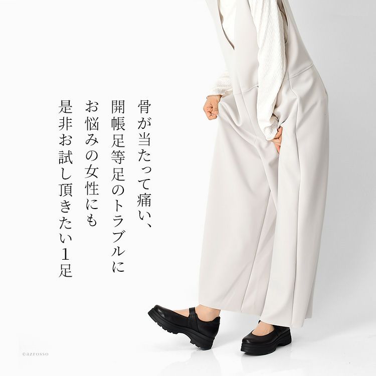 足を締め付けず開放感のある幅広4Eワイズ、安定感抜群の厚底パンプス。外反母趾など足の形で靴選びにお悩みの方にもおすすめの一足。