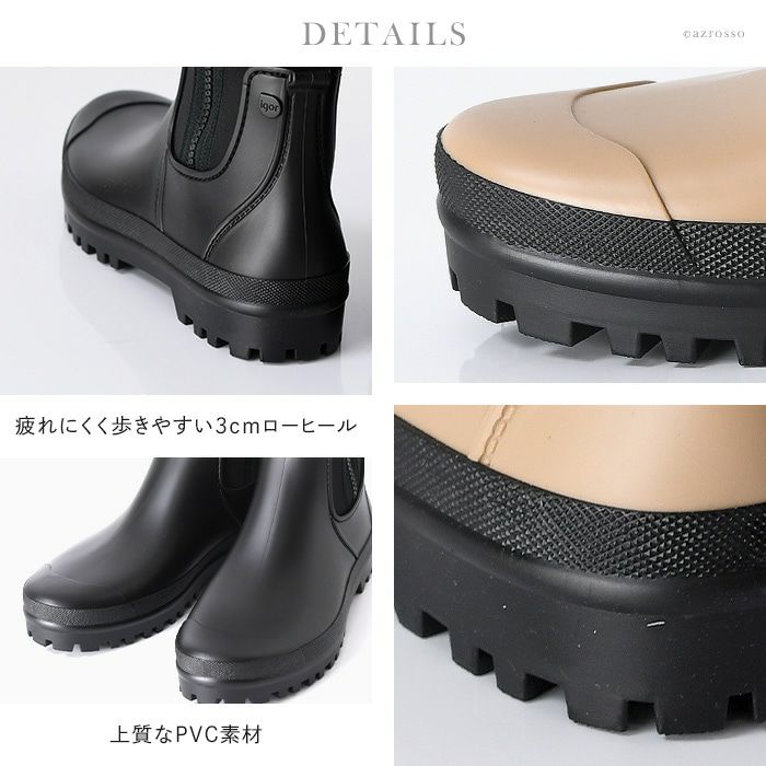 スニーカーとショートブーツの間のような丈感がおしゃれなレディースレインブーツ。デザインはシンプルなサイドゴアですが、ソールの色が真っ白ではなく淡いベージュになっていたり、滑りにくいぽこぽこしたソールを使用していたり、さりげないところまでおしゃれな1足。
