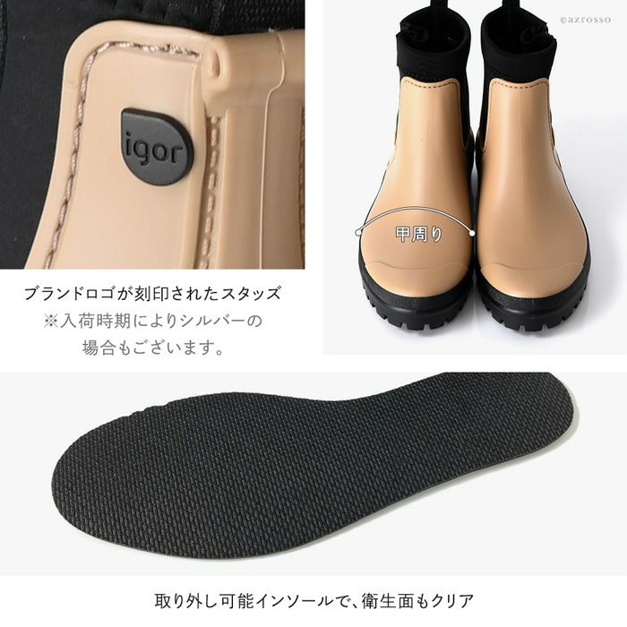 スタイルアップと程良いトレンド感を兼ね備える厚底タイプのチェルシーレインブーツ。イゴールらしい細身のデザインは保ったまま、ボリューミー過ぎないところが◎きれいめコーデのアクセントにもぴったりです。