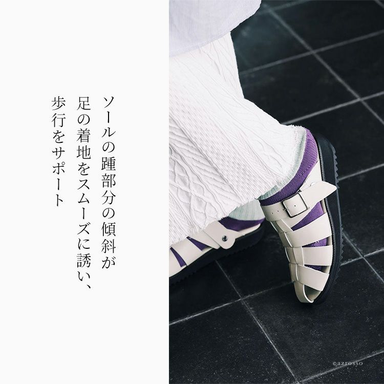 さっぱりと履けるスエードのインソールに、スポンジをギュッと固くしたような、 クッション性が高く軽いEVAソールを採用。 履きやすく、長時間履いていても疲れにくい仕様になっています。