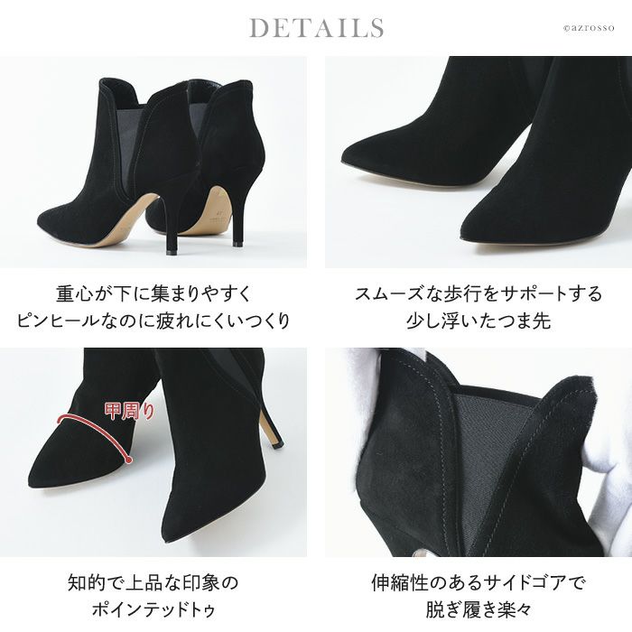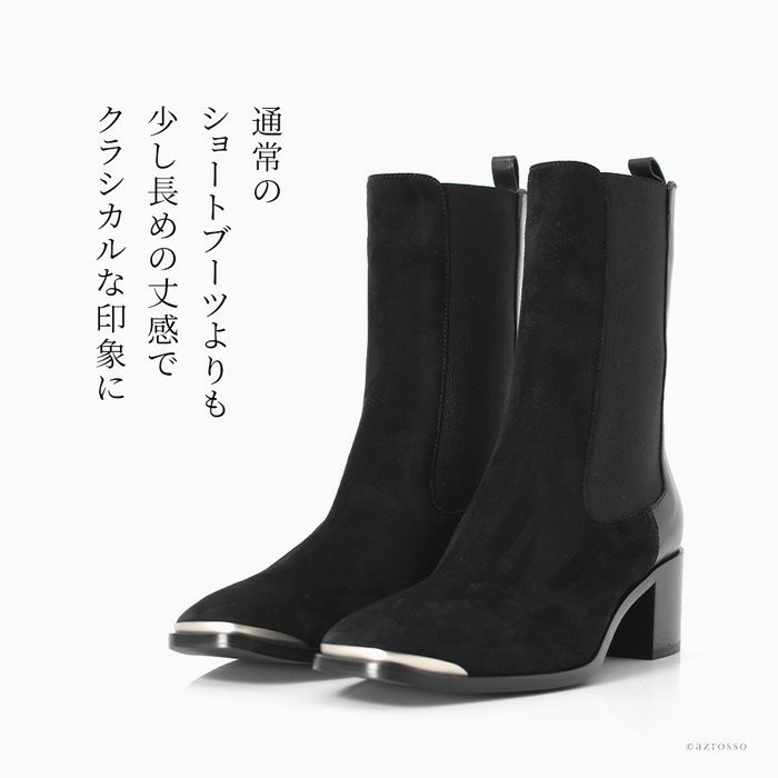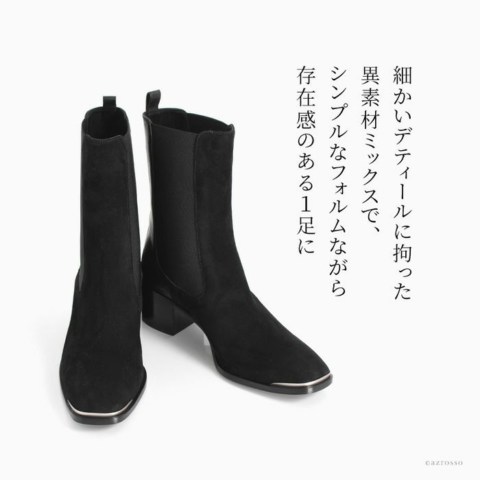 しっとりなめらかな極上スエードとナッパレザー、メタルの縁取りをおしゃれに組合せて、女性らしいデザインに仕上げました。ショートブーツのようでありながらサイドゴアの履きやすさを堪能できます。