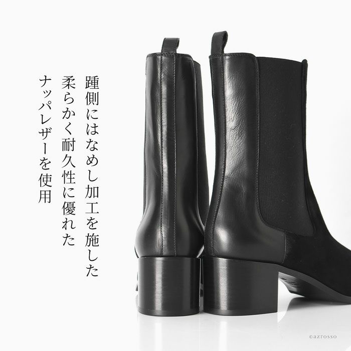 シンプルで使いやすい定番のチェルシーブーツにひとひねり。ストレッチが効いたサイドゴア部分にも、プリーツのようなレザーを施しました。