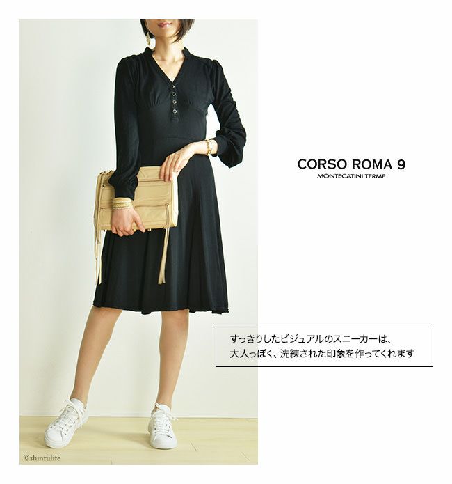 ナチュラルなワンピースに合わせる白スニーカーには、同系色のカラーの靴下が悪目立ちせず、コーデに一体感を与えてくれます。