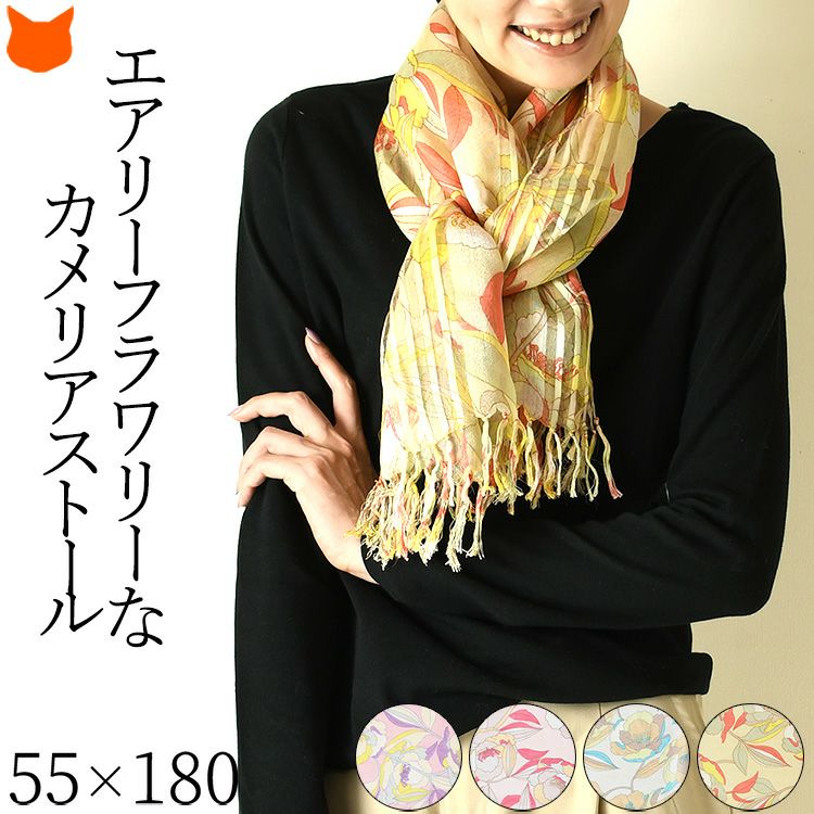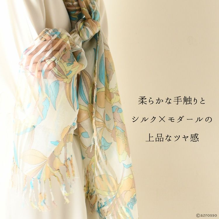 水彩画のような大ぶりのカメリアが優美な美しさ。シルク×モダールをブレンドし、柔らかな手触りとツヤ感を両立。かさばらないのでオフィス内でもじゃまにならず、羽織りにしてもひざ掛けにしても◎