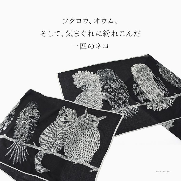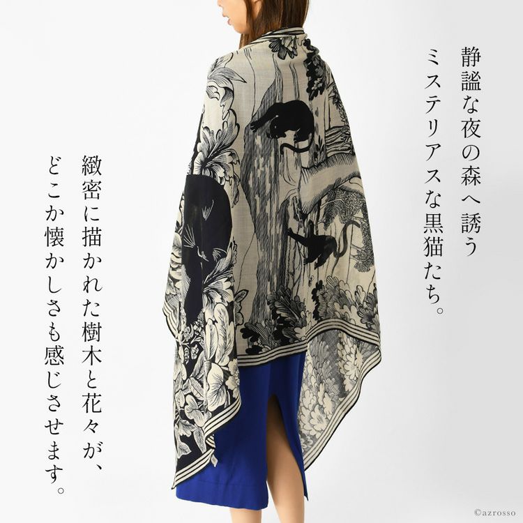 神秘的な森へ貴女を誘う黒猫たちを描いた1枚。猫が見えるように巻いたり、サッと羽織って花柄ボレロのように楽しんだりと、何通りもの使い方を楽しめます。