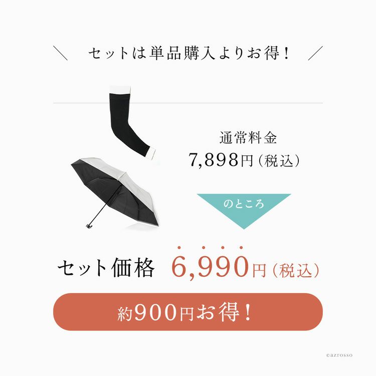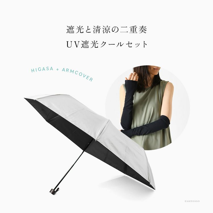 遮光と清涼の二重奏、日焼け対策と紫外線対策をしつつひんやり涼しいUVカットほぼ100%の日傘とアームカバーのセットが登場。単品購入より断然お得な「UV遮光クールセット」 UV遮光クールセット 折りたたみ日傘 アームカバー 冷感 ロング丈 ひんやり涼しい 傘 60cm 大判 レディース