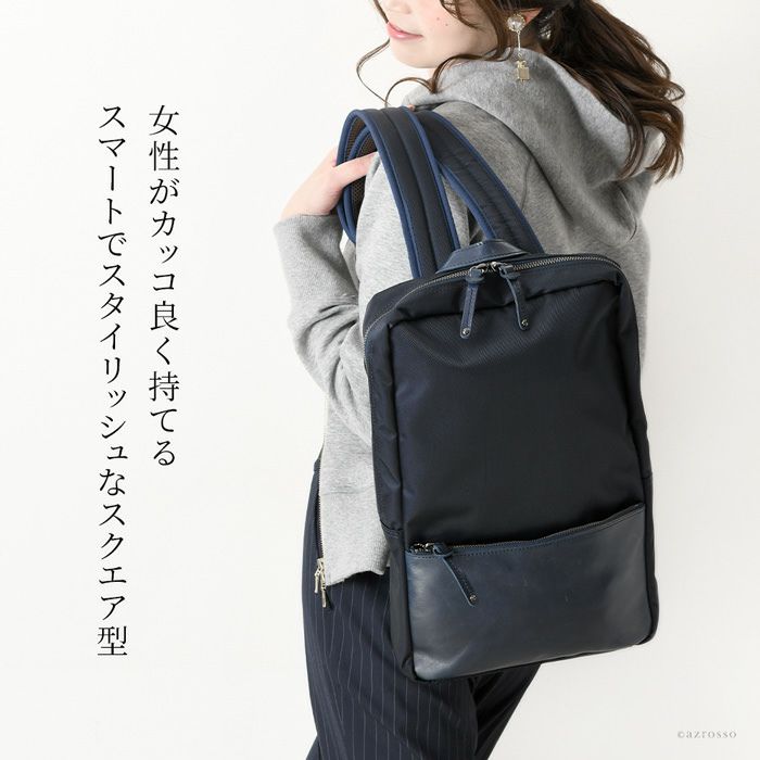 日本製 ナイロン レザー リュック 500g以下 軽量 薄型 PC収納 軽い ビジネスリュック レディース ネイビー 紺