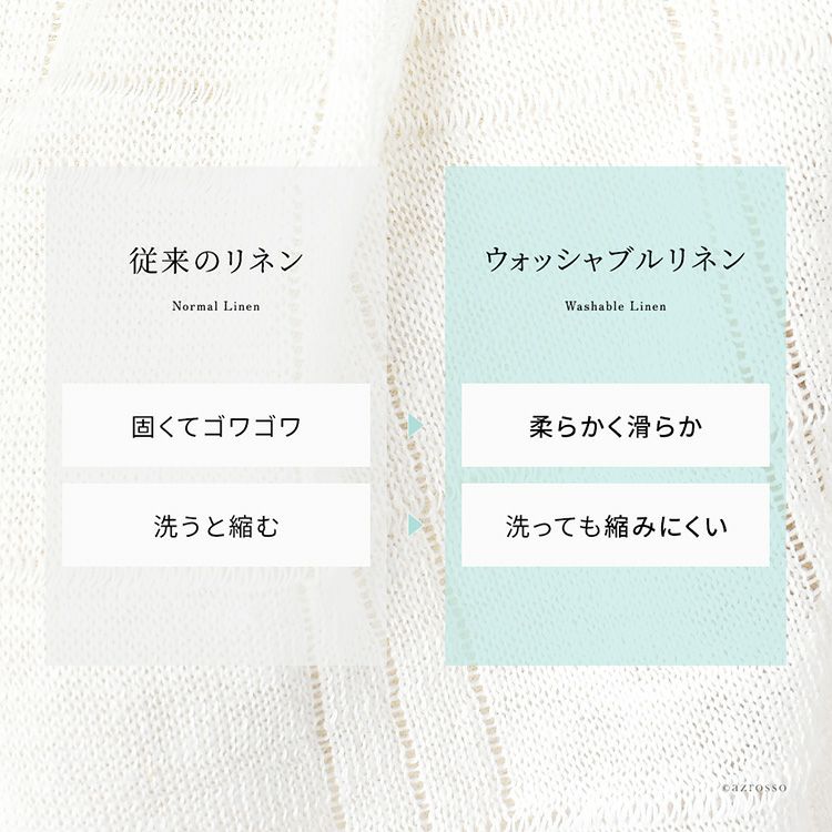 極上のなめらか肌ざわり。洗っても縮みにくいウォッシャブルリネンで、夏の汗ばむ季節でも安心して着られます。