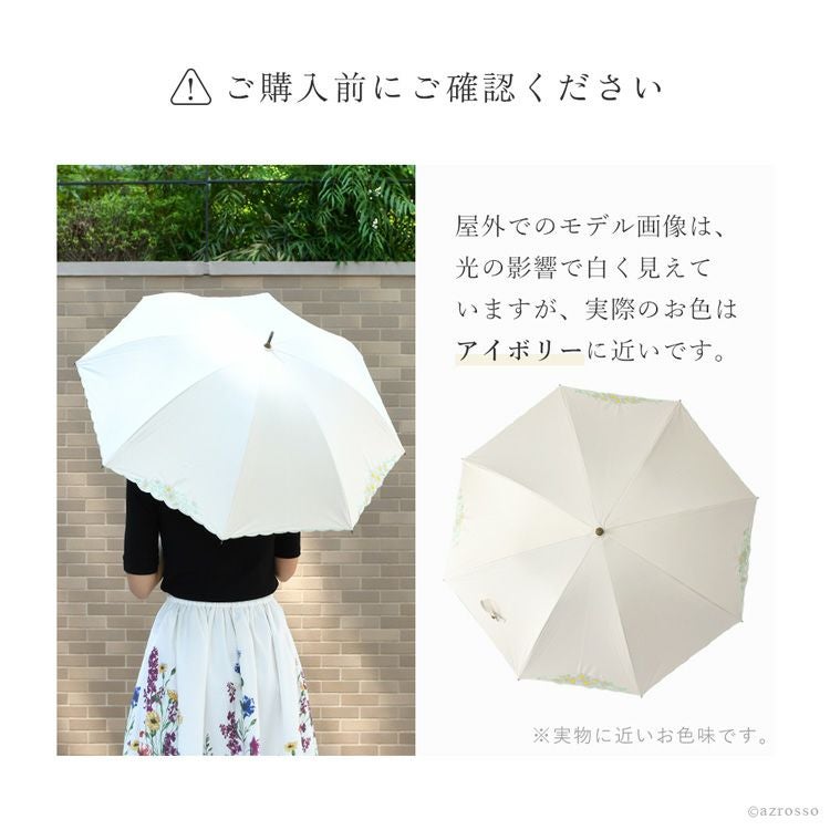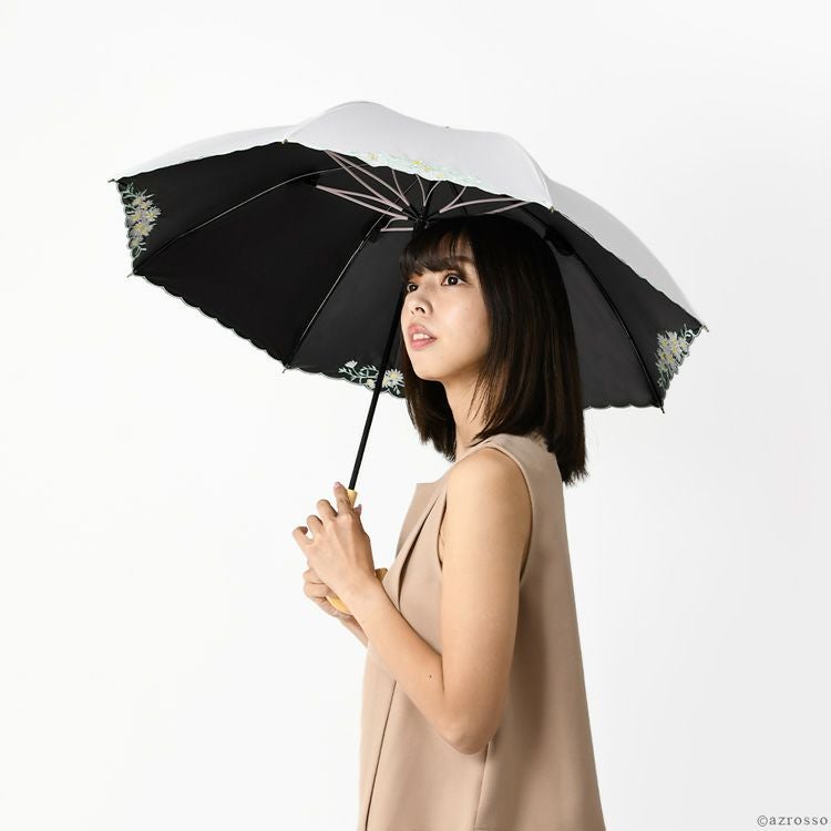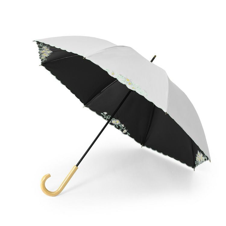 控えめデイジーフラワー刺繍が可憐で清楚な夏の日傘。UVカット&遮光100%の完全遮光仕様で紫外線から肌を守ります。手開きタイプ。遮熱効果を備え涼しさも。晴雨兼用で通勤やお出かけにもおすすめ 刺繍入り日傘 レディース 長傘 桜骨 晴雨兼用 UVカット100% 遮光100% 完全遮光 涼しい 軽量 内側黒 ブラックコーティング