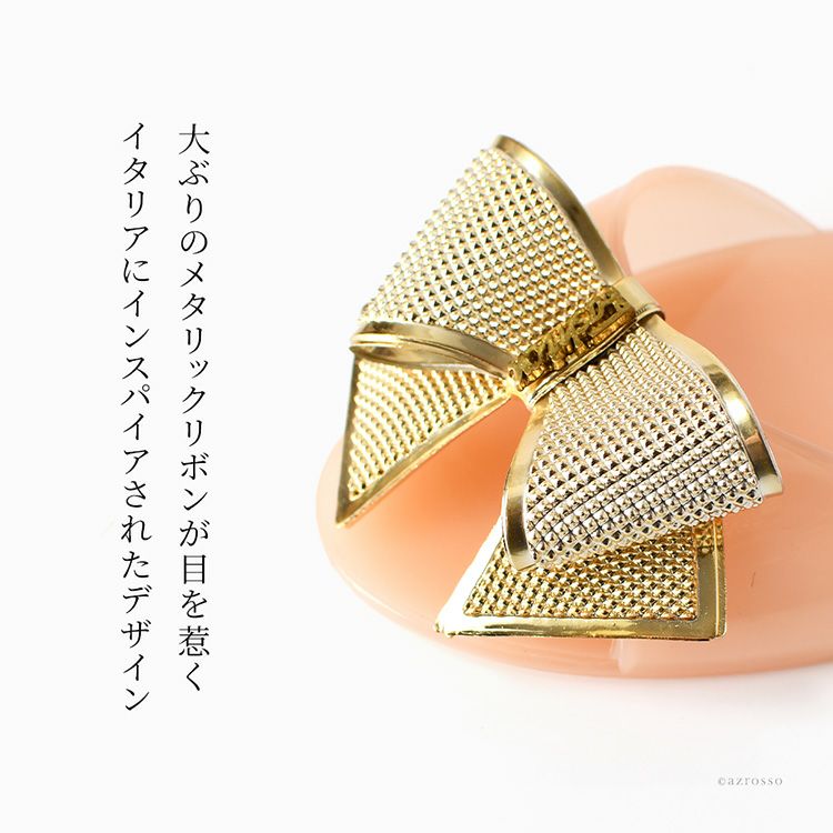 夏の足元を美しく飾るjelly d'arancia(ジェリーアランチャ)の煌めくラバーサンダル。大ぶりのメタリックリボンが目を惹くイタリアにインスパイアされたデザイン。レインサンダルとしてもおすすめ リボン ラバーサンダル 晴雨兼用 レインサンダル オープントゥ フラットシューズ レディース