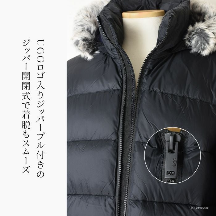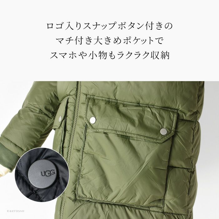 軽くて暖かいUGGミドルレングスパファージャケット。取り外し可能なフェイクファートリム付きフード、ハイジップ、サムホール付きリブ袖、大きめポケットとファッション性と機能性を兼ね備えたアウター 日本未発売 UGG アグ アウター UGG Ozzy Mid-Length Puffer Jacket 中綿ジャケット フェイクファートリム付き フード付き キルティングジャケット 黒 ブラック ネイビー カーキ